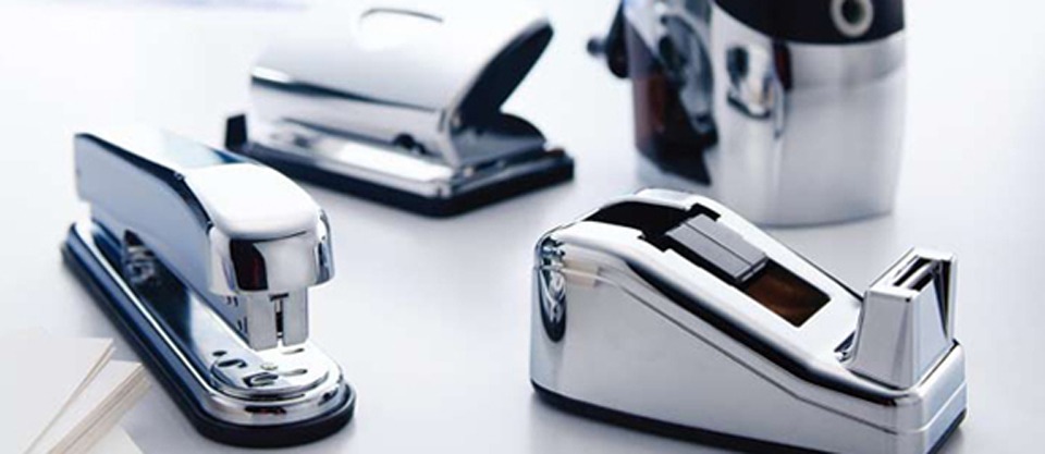 - Desk accessories including staplers, punches, clips, tape, and pins
