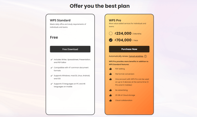 The prices are very affordable. With this alternative, you can achieve what you want with ease and control. WPS Office (from the WPS Official Website) offers tremendous features for low prices, more or less, making it accessible even to students and professionals with limited resources. With this low-cost options, you will get better quality and more functionality compared to other similar office products available. And the low pricing model works in their favor.